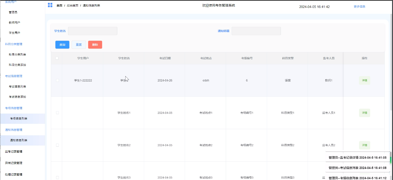 (5)通知信息管理:管理员负责发布和管理各类考务通知,包括考试名称、时间、地点、考试科目、监考人员、通知标题等重要信息。通过通知信息管理,管理员可以确保考生和相关人员及时获取考试相关的最新动态。