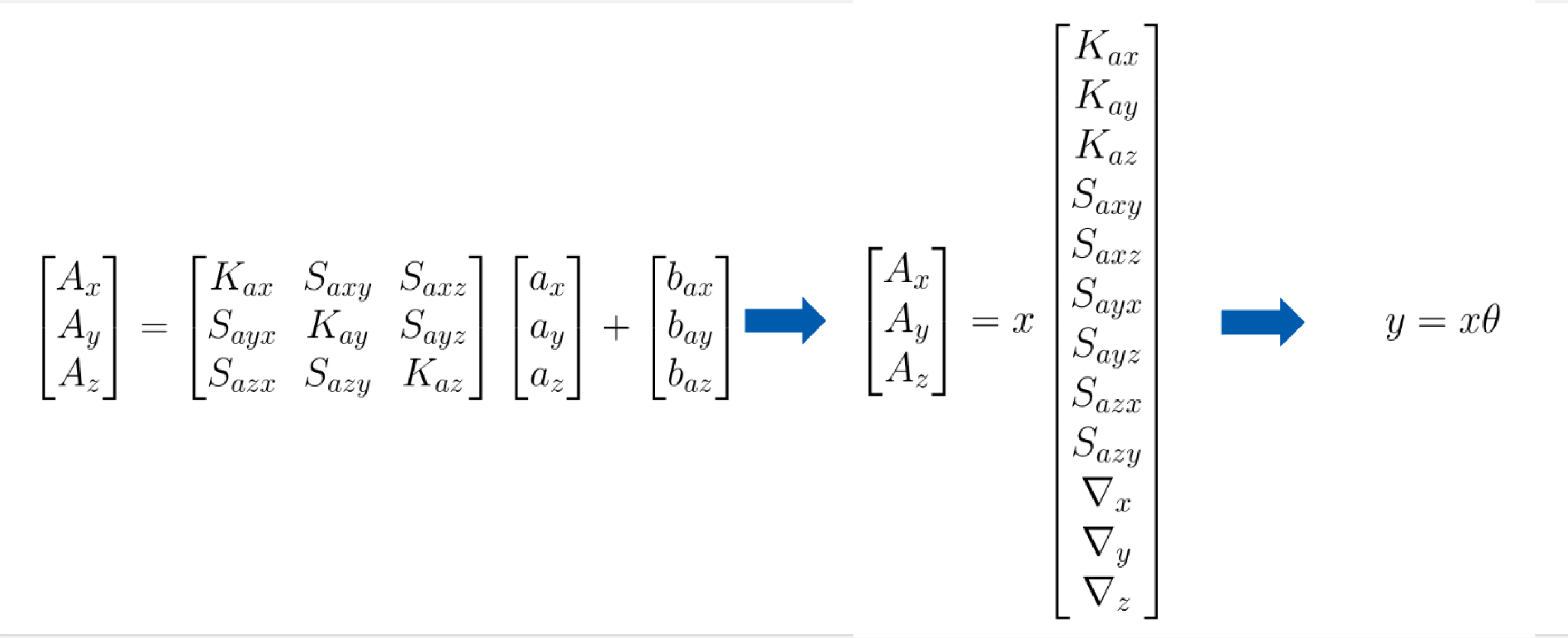 所以基于优化模型的标定建立一个逆向公式,描述“如果传感器输出了A,经过误差参数的修正,真实的输入a应该是多少”。也就是: