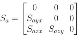 其中a为传感器的理想输入(真值),A为传感器的读数。因为Sa的对角线元素大小近似为1,并且在标定中对角线的余弦因子会被刻度系数K吸收(K近似单位矩阵),所以加速度计的安装误差矩阵可以简化为: