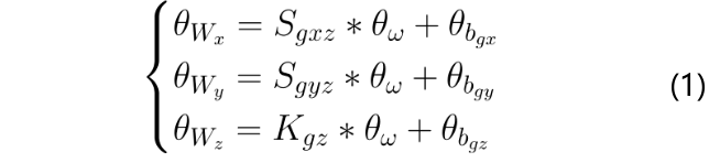 (3)安装误差。如下图所示,b坐标系是正交的imu坐标系,g坐标系的三个轴是分别对应三个陀螺仪。由于加工工艺原因,陀螺仪的三个轴并不正交,而且和b坐标系的轴不重合,二者之间的偏差即为安装误差。