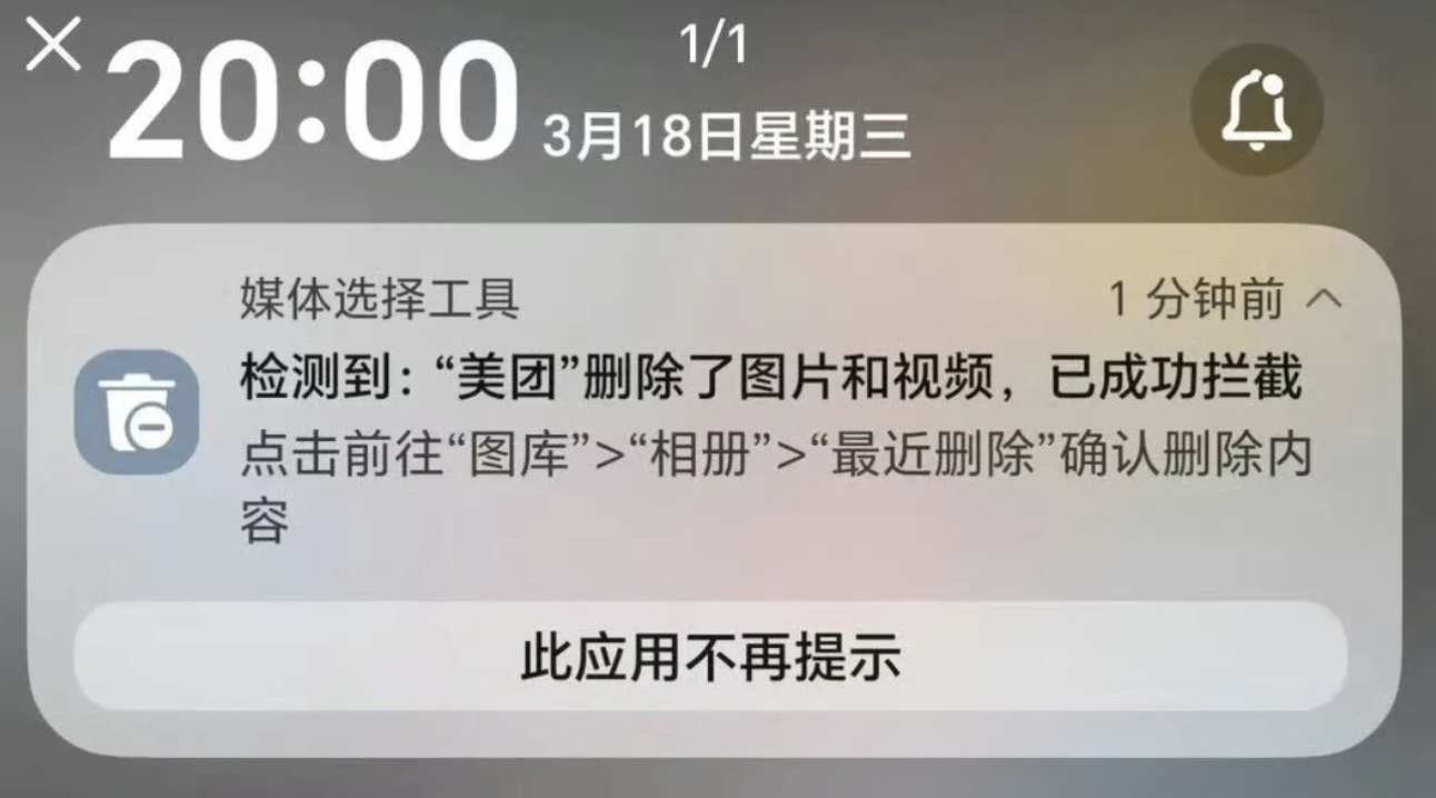 管理层沟通会后不到一周,3月18日,有安卓用户爆料在使用美团点外卖、浏览团购时,手机突然弹出系统级警示:“检测到‘美团’删除了照片和视频”。用户晒出的手机截图显示,在删除过程中,用户能够在手机界面上清楚看到操作提示,还有网友反馈称,其手机曾被美团删除文稿、音频等各类文件,并且无法恢复。