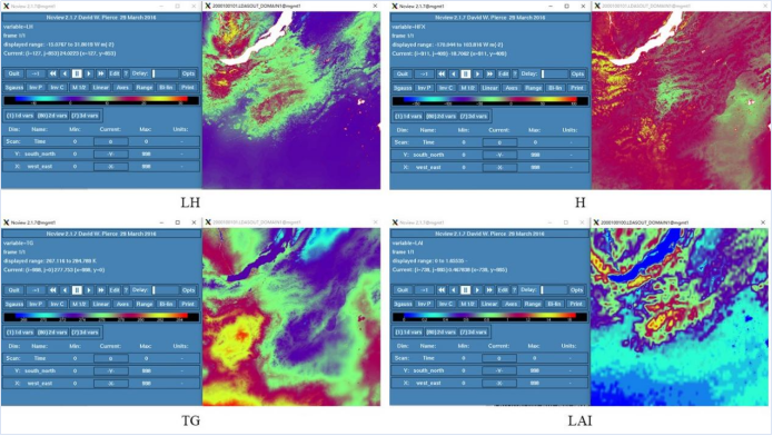 运行模型:根据研究区实际情况与模拟需求修改namelist.hrldas文件,./hrldas.exe即可启动模型,结果将以netCDF格式输出至指定文件夹内