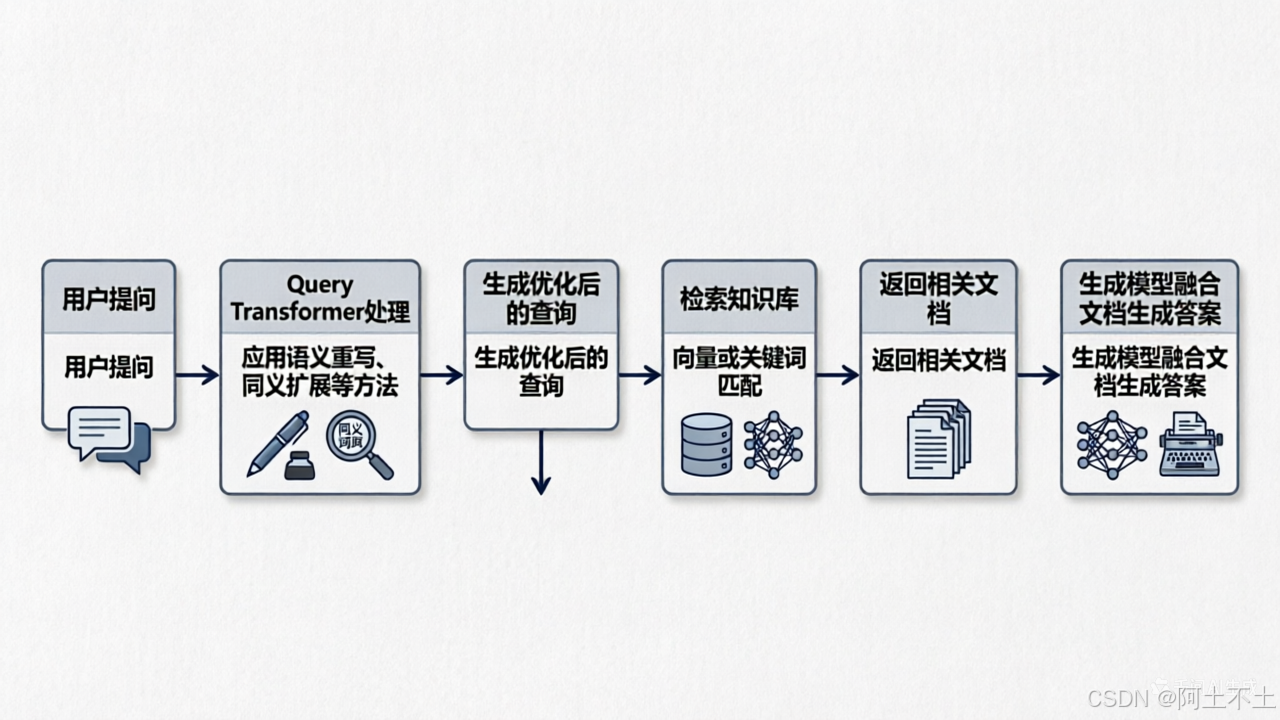 在RAG系统中,Query Transformation通常位于检索模块前,作为预处理环节。其典型流程为: