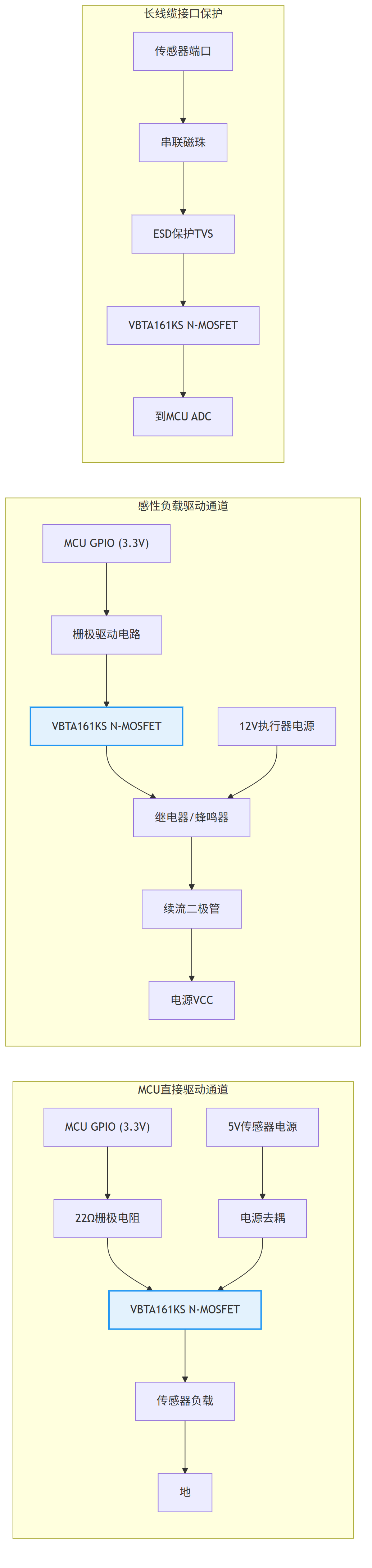 - 小信号MOSFET(如VBTA161KS):MCU直驱时,注意GPIO驱动能力是否足够,并配置栅极电阻。
