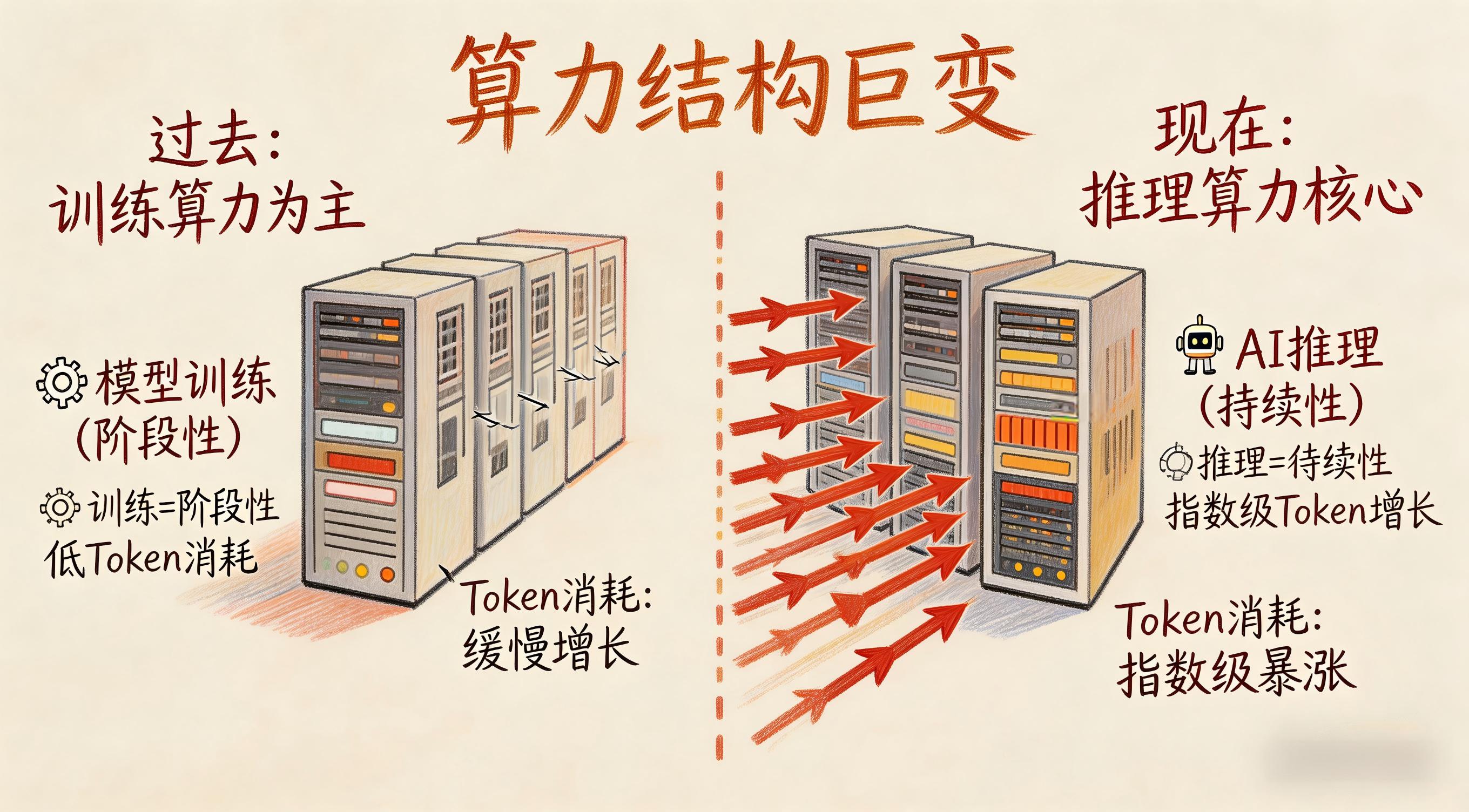 过去,算力主要用于模型训练; 而现在,推理(Inference)成为算力消耗的核心来源。