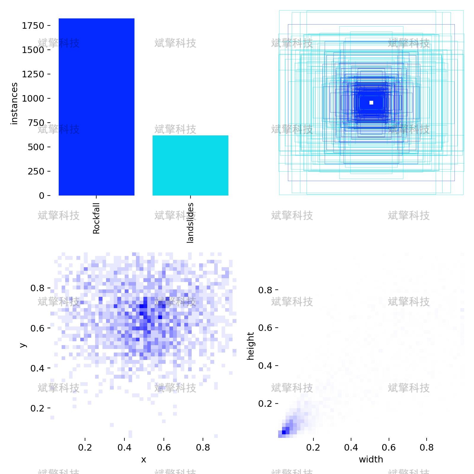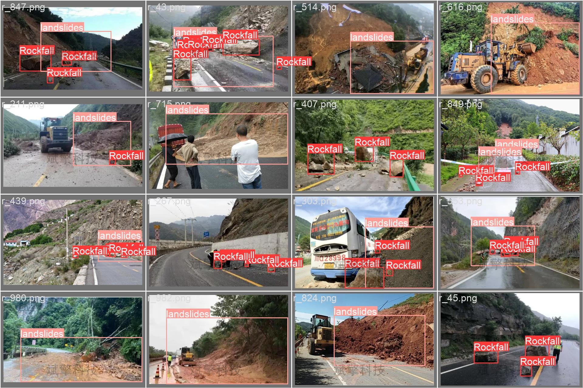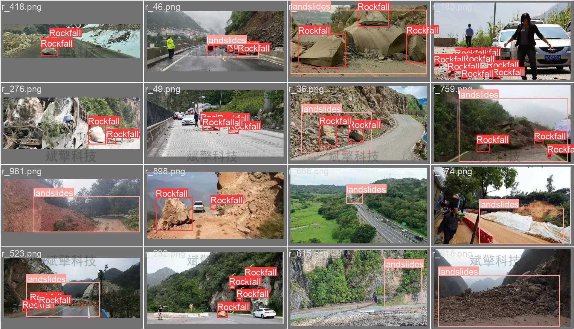 本系统所使用的数据集主要来源于公开的地质灾害图像库、野外实地拍摄以及网络采集的多源影像数据,经过严格筛选与清洗后构建而成。数据集针对两种典型的地质灾害类型——落石(Rockfall) 和滑坡(landslides)——进行标注,共计包含1000张高质量图像。