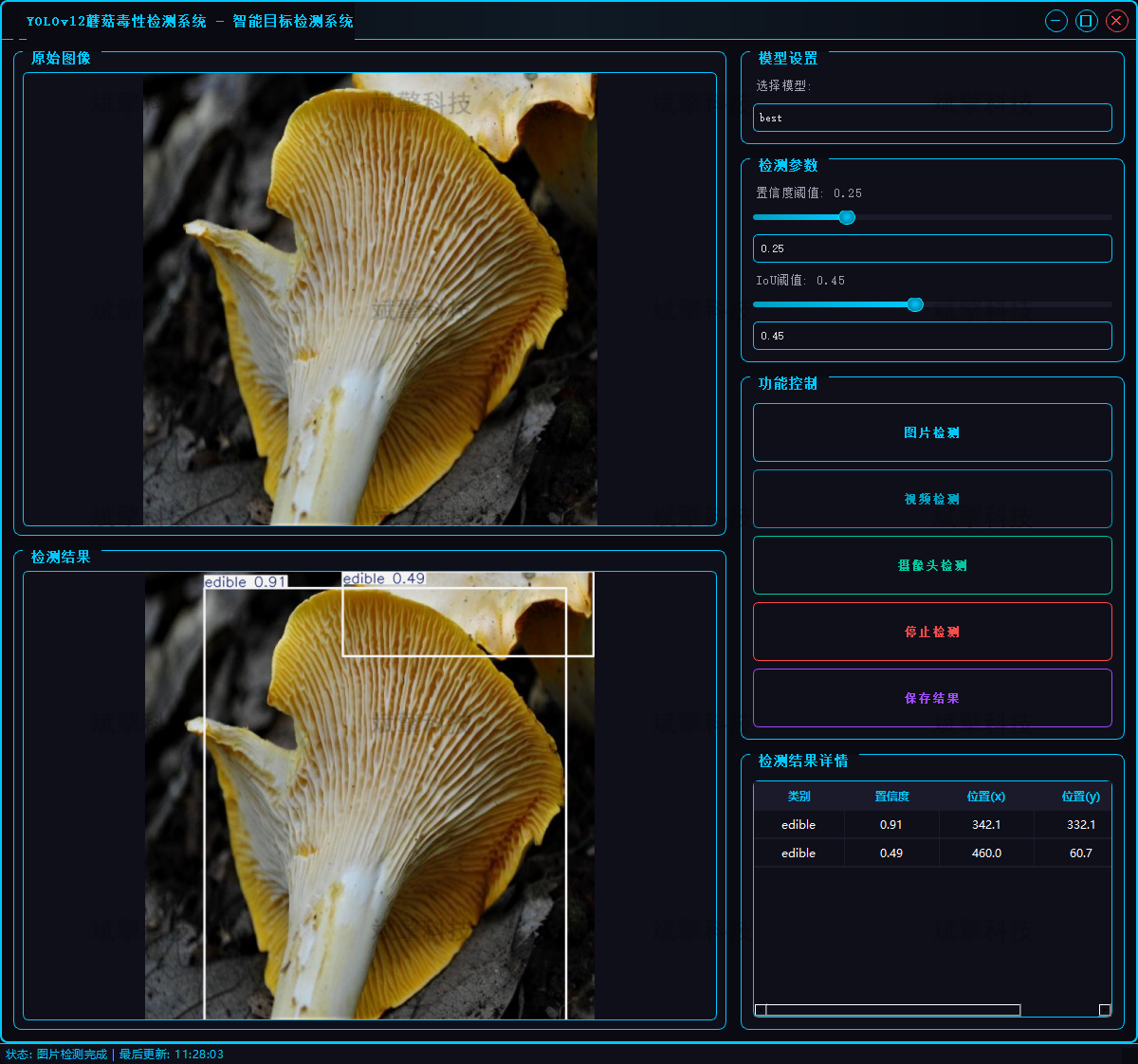 在实际应用场景中,用户可通过上传蘑菇图片快速获取毒性分类结果,也可对野外拍摄的蘑菇视频进行逐帧检测,或通过摄像头实时识别镜头中的蘑菇类型,系统能够输出蘑菇的类别标签、置信度及目标框位置。