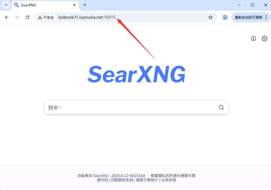 12,在外网电脑上,打开浏览器,在地址栏输入从路由侠生成的外网地址,就可以看到内网部署的 SearXNG 搜索界面了。