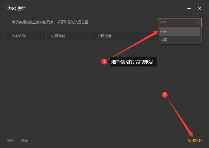 8,注意右上角的设备名称下拉框,这里选中刚刚添加的设备名称,此时在这个界面上添加的映射,就属于刚刚这个设备。添加或修改一般需要等待 30 秒,容器中的路由侠进程就会更新并加载。切换好设备后,点击【添加映射】。