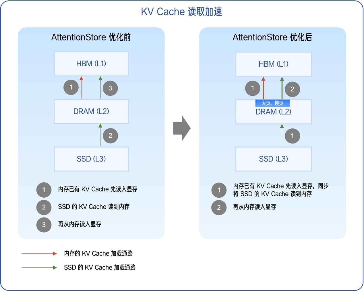 - KV Cache 读取加速:在 HBM、DRAM 与 SSD 混合命中的场景下,传统的 KV Cache 读取采用串行逻辑(如下图左侧「AttentionStore 优化前」所示),这种方式的读取耗时较长。对此,我们通过将 KV Cache 的读取过程拆分为并行任务 —— 让高速介质与低速介质同步发起传输(如下图右侧「AttentionStore 优化后」所示),最大程度缩短全部 KV Cache 的读取耗时。此外,我们将 AttentionStore 管理的共享内存标记为大页内存,显著减少页表项数量,降低地址转换开销,提高内存访问效率;同时,通过全生命周期锁页操作,避免 KV Cache 数据在传输过程中被换出,减少额外的内存拷贝与页错误开销,使数据能够以更稳定、更高带宽的方式直达显存。实测显示,DRAM 到 HBM 的通信效率较基线提升了 4 倍,让 DRAM 与 SSD 中的缓存数据能够更快进入显存参与计算;