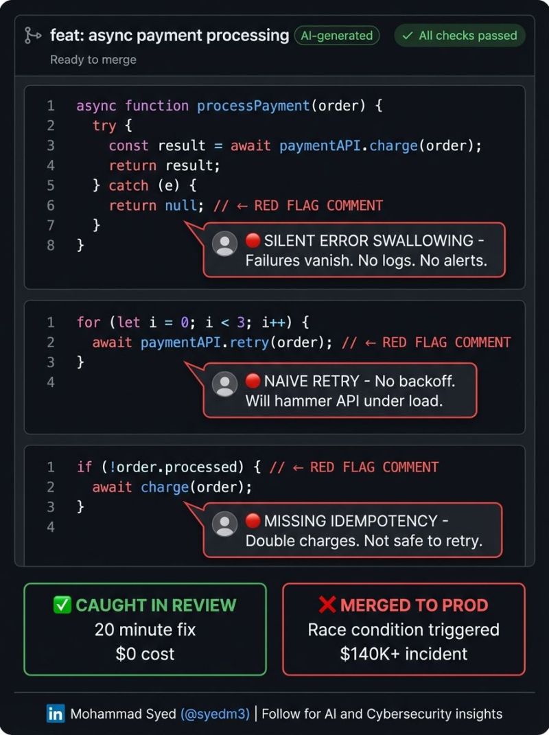 我审计过的一家科技公司,曾因一段 AI 生成的异步支付处理代码,遭遇了一场灾难性的生产事故。这段代码完美通过了所有自动化检查、单元测试与集成测试,标注着「All checks passed」被顺利合并到生产环境,最终却触发了竞态条件与重复扣款,造成了超 14 万美元的直接资金损失,连带用户投诉、品牌声誉受损与合规风险,后续补救成本更是难以估量。