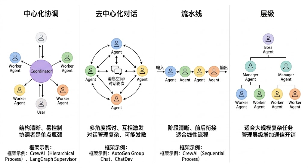 多 Agent 对应带来了几个核心优势:专业化分工让每个 Agent 的 Prompt 精简且专注,决策质量显著提升,而且独立的"审查 Agent"可以避免自我确认偏见;上下文隔离让每个 Agent 只关注自己职责范围内的信息;可并行执行的子任务交给不同 Agent 同时处理也大幅缩短整体耗时。在协作模式上,主要有中心化协调(Supervisor 分配任务,CrewAI 和 LangGraph 都支持)、去中心化对话(Agent 之间直接讨论,AutoGen 的 Group Chat)、流水线和层级四种模式,根据任务特点选择。