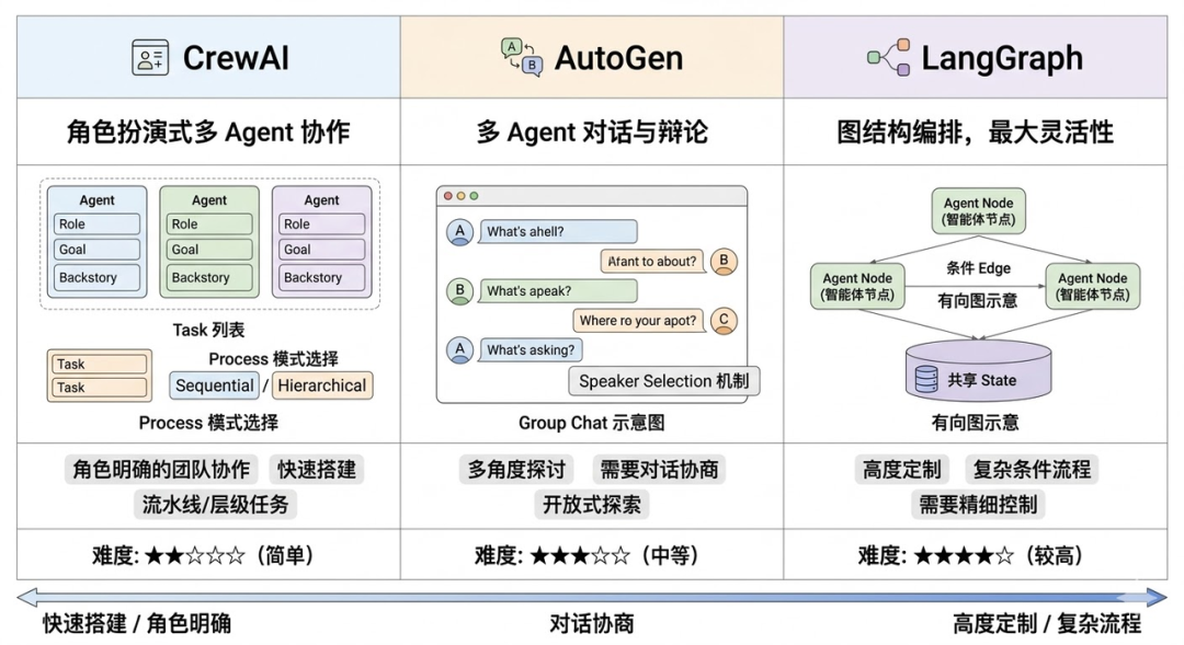 选型原则很简单:如果你的任务可以分成几个明确的角色用流水线或层级方式协作,CrewAI 是最快的选择;如果需要 Agent 之间自由讨论辩论,AutoGen 更合适;如果需要高度定制的复杂协作流程,LangGraph 给你最大的控制力。