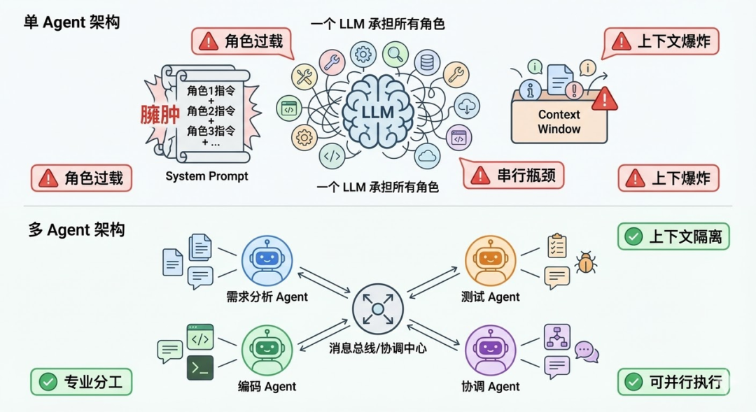 它的出现本质上是为了解决单 Agent 的三个瓶颈:第一是角色过载,一个 Agent 同时承担多种角色时 Prompt 臃肿、角色指令互相干扰,质量下降明显;第二是上下文压力,大量工具定义和推理历史撑满窗口;第三是串行瓶颈,单 Agent 无法并行处理任务的不同部分。