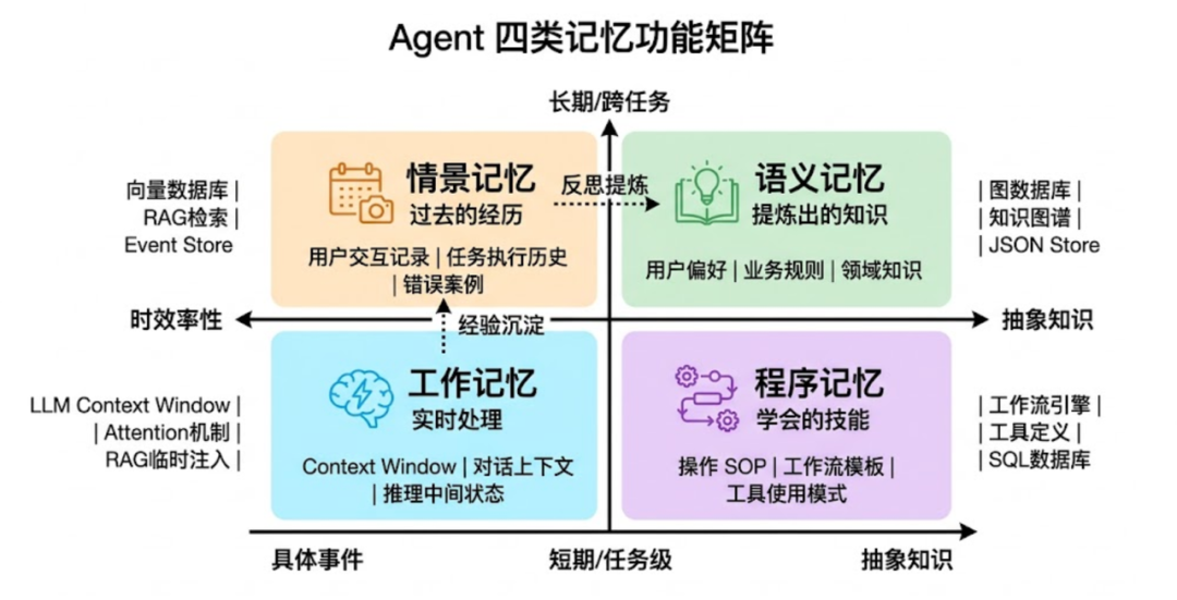 这四类记忆不是割裂的,而是有明确的流转关系:工作记忆中的重要片段会沉淀为情景记忆,多次情景记忆经过反思和提炼会升级为语义记忆,反复执行的操作模式会固化为程序记忆。理解这个流转关系,才能设计出合理的记忆写入和提升机制。