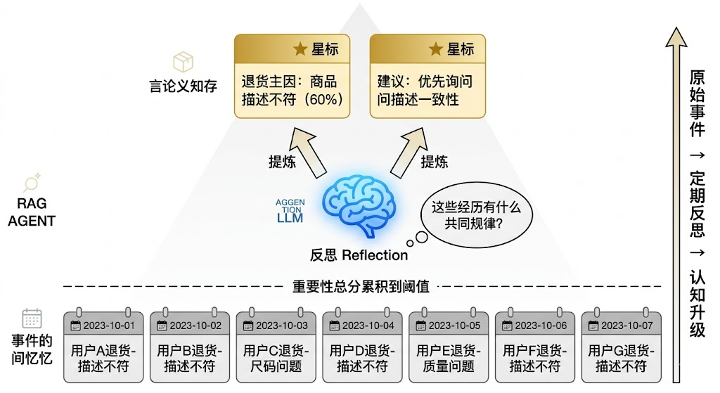 纯粹的事件记录(情景记忆)会让记忆库越来越庞大,但 Agent 的认知水平却没有真正提升。就像一个人经历了一百次客户投诉但从来不总结规律,他处理第一百零一次投诉时不会比第一次强多少。