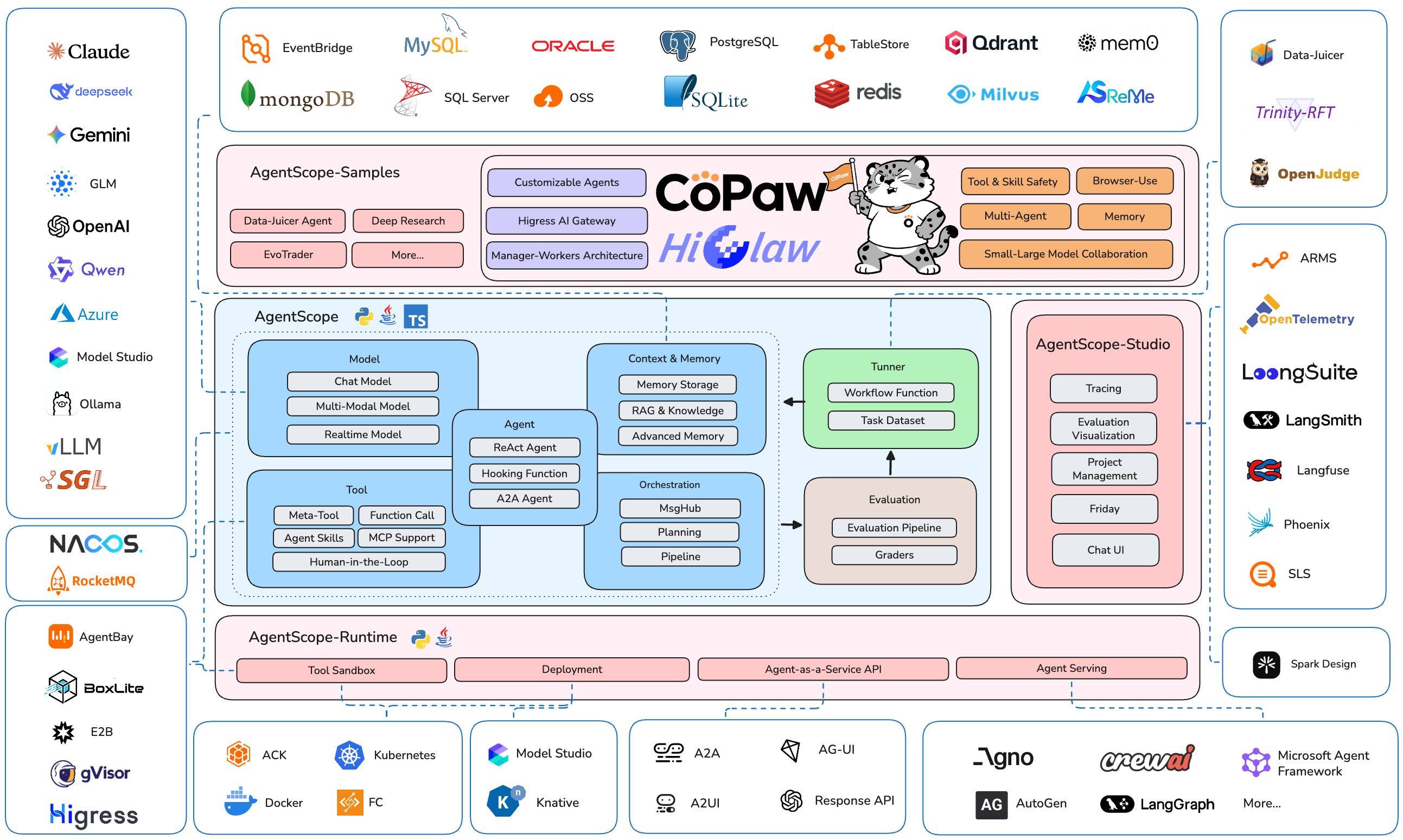 基于 AgentScope 框架,扩展了成一整套生态,包括: