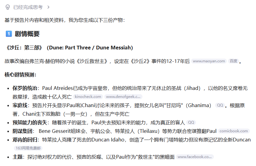 我把《蜘蛛侠4》的预告片丢给它,让它做一份观影前科普。