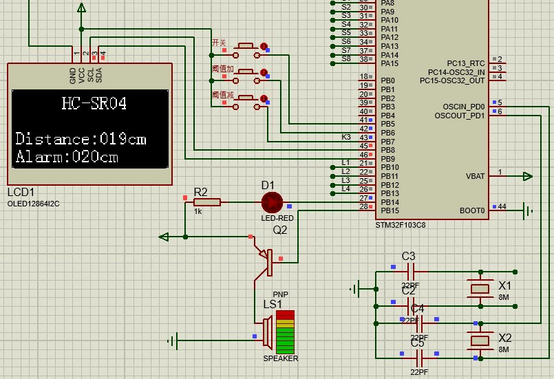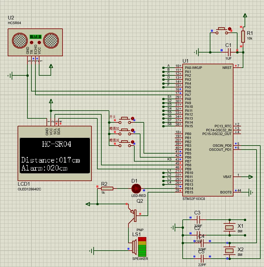 最近鼓捣了个小项目,用STM32做了个超声波测距报警,带OLED显示和按键调节,Proteus仿真跑起来还挺流畅,顺手把代码和设计思路整理了下,给想入门的小伙伴参考~