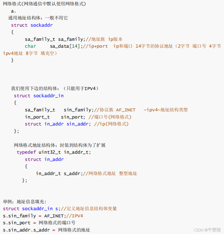就是指定地址为 0.0.0.0 的地址 任意地址,也可只写一个0INADDR_ANY 已经定义为一个网络字节序的常量 最好使用标准的 INADDR_ANY 常量而不是直接用0 来替代它// 让服务器端计算机上的全部网卡的 IP 地址均可以做为服务器 IP 地址,也即监听外部客户端程序发送到服务器端全部网卡的网络请求例如:填充本地地址信息struct sockaddr_in s ;s . sin_family = AF_INET ; //IPV4s . sin_port = htons ( 49160 )s . sin_addr . s_addr = INADDR_ANY ; // 绑定服务器所有网卡 ip![]()