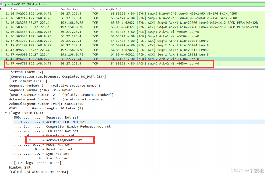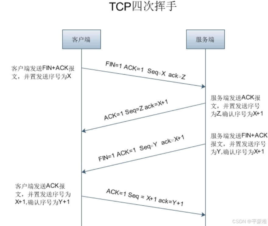 第二次挥手第三次挥手合并了原因:当被挥手端第一次收到挥手端的 “FIN” 请求时,并不会立即发送 ACK ,而是会经过一段延迟时间后再发送 ( 等待本端数据处理完毕 ) ,但是此时被挥手端也没有数据处理,就会向挥手端发送 “FIN " 请求,这里就可能造成被 挥手端发送的“FIN” 与 “ACK” 一起被挥手端收到,导致出现 “ 第二、三次挥手 ” 合并为一次的现象,也就最终呈现出“ 三次挥手 ”第四次挥手![]()