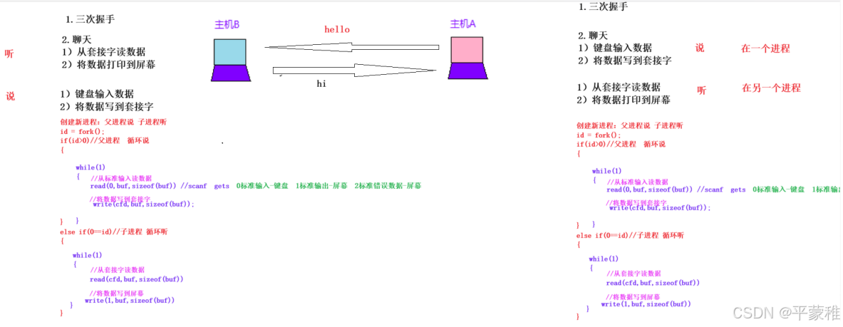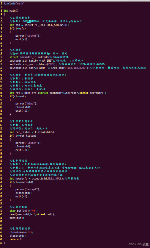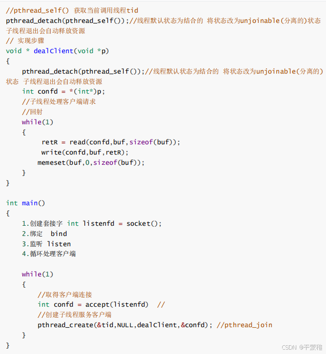 1. 创建套接字 int listenfd = socket2. 绑定 bind3.listen4.while ( 1 ){// 取得客户端连接int confd = accept ( listenfd )// 创建子进程服务客户端id = fork ();if ( 0 == id ) // 子{dealClient ( confd ); // 处理客户端请求}}void dealClient ( int confd ){while ( 1 ) // 循环处理客户端请求{}}
