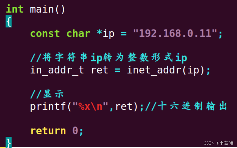 (1)点分十进制 ("192.168.0.11" 字符串) //char ip[16]="192.168.0.11";(这是默认ipv4(32位))(2)整型 (网络通信使用的网络格式地址)192. 168. 0. 11二进制 1100 0000 1010 1000 00000000 0000 1011十六进制 c 0 a 8 00 0 b1 byte == 8 bit 8 个二进制位1 个十六进制 == 4 个二进制位2 个十六进制 == 8 个二进制位 == 1 字节