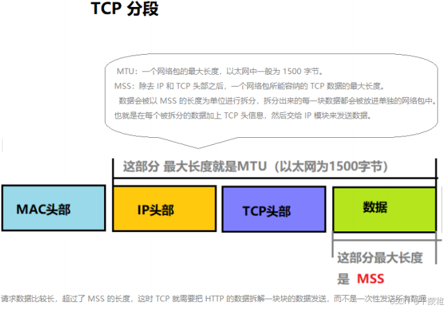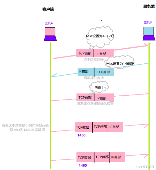 握手时协商MSS值-了解:假如 TCP 不分段的话 , 需要传输一大份数据的时候 , 有可能数据丢失了 , 那么 TCP 就得传输整份完整的数据 , 而分段的话 , 丢失了哪一块就传哪一块 , 提高了效率 .MSS (最大消息长度):发送数据包的单位。 MSS 位于 TCP 首部的可选项中 , MSS 选项用于在 TCP 连接建立时,收发双方协商通信时每一个报文段所能承载的最大数据长度TCP 传输数据时,以 MSS 的大小将数据进行分割发送。MSS 是在三次握手时,通信双方就需要协商 MSS 值 [ TCP 最大报文段值 ] ,取两端主机能够适用的 MSS 的最小值。以太网报文最大值 MTU [ Maximum Transmission Unit ], 通常为 1500 字节MSS = TCP 数据部分, MTU = TCP 数据部分 + TCP 首部 + IP 首部;最理想情况下: MSS + TCP首部+IP首部 = MTU MSS = MTU - tcp头部20字节 - IP头部20字节 = 1460字节假设 MTU = 1500 byte ,那么 MSS = 1500 - 20 ( IP Header ) - 20 ( TCP Header ) = 1460 byte ,如果应用层有 2000 byte 发送,那么需要两个切片才可以完成发送,第一个 TCP 切片 = 1460 ,第二个 TCP 切片 = 540 。