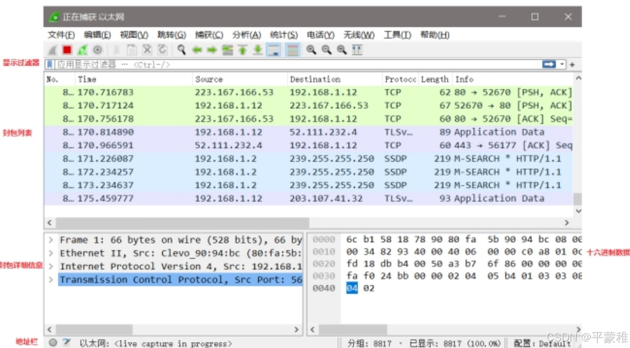 WireShark 主要分为这几个界面:Display Filter( 显示过滤器 ) ,用于过滤。Packet List Pane( 封包列表),显示捕获到的封包,有源地址和目标地址,端口号。颜色不同,代表Packet Details Pane(封包详细信息 ), 显示封包中的字段。Dissector Pane(16进制数据 ) 。Miscellanous(地址栏,杂项 ) 。