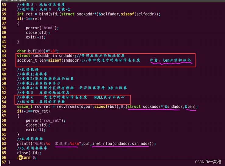 size_t=unsigned intssize_t recvfrom ( int sockfd , void * buf , size_t len , int flags , struct sockaddr* src_addr , socklen_t * addrlen );功能:接受数据参数 1 : socket 返回值参数 2 :存放收到的数据参数 3 :参数 2 的大小参数 4 :如果没有数据到来 阻塞等待还是不等待 0 表示阻塞 MSG_DONTWAIT 不等待参数 5 :发送方的地址信息参数 6 :发送方地址信息长度 ** 注意:传的实参必须初始化 **返回值:成功返回收到的字节数 失败 - 1 ssize_t 有符号整型![]()