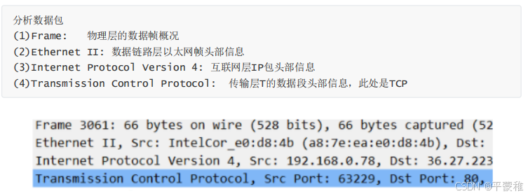 tcp . port == 80 , 显示源主机或者目的主机端口为 80 的数据包列表。tcp . srcport == 80 , 只显示 TCP 协议的源主机端口为 80 的数据包列表。tcp . dstport == 80 ,只显示 TCP 协议的目的主机端口为 80 的数据包列表。// 也可以将上面的 tcp 改成 udp