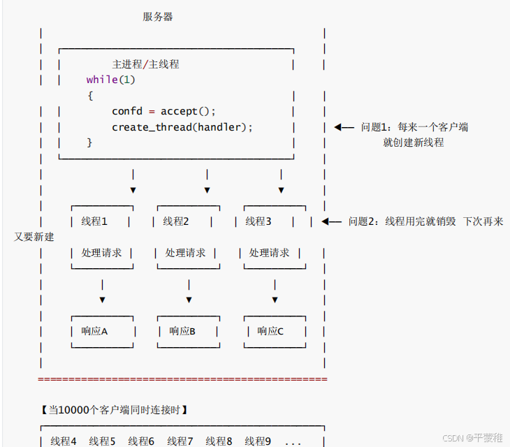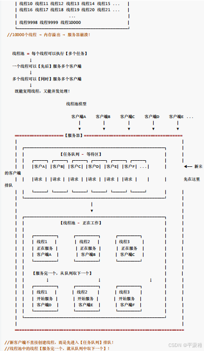 解释: // 假设处理客户请求的时间不长,当大量客户陆续接入的时候,那么服务器对每个客户都将做这样的处理:创建线程 -> 处理客户请求 -> 销毁线程;由于每个客户请求的处理时间都不长,而创建线程和销毁线程需要花费较大的系统开销,所以当大量客户接入的时候服务器将花费大量的时间在创建和销毁线程上面,从而影响服务器性能。线程池作用:多线程并发服务器,频繁的创建和摧毁线程,浪费系统开销线程池,提前就已经创建好了多个线程,处于休眠状态 ( 阻塞等待 ),有任务的时候,自动唤醒线程,没有工作任务,再次休眠用休眠和唤醒来替换创建和摧毁