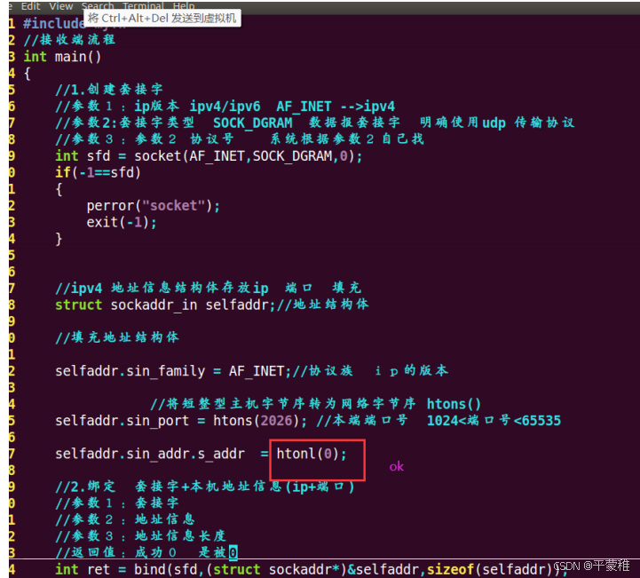 地址信息 =ip+ 端口 + 协议族 (ip 类型 )bind 地址信息+套接字int bind ( int sockfd , const struct sockaddr * addr , socklen_t addrlen );• 功能:绑定• 参数 1 : socket 返回值• 参数 2 : 地址信息• 参数 3 :参数 2 的大小• 返回值:成功 0 失败 - 1![]()