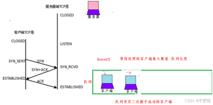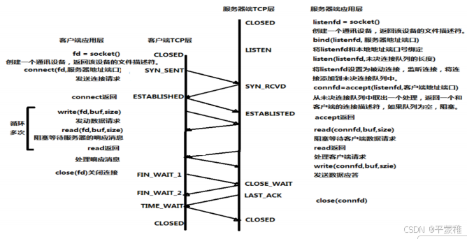 服务器必须准备好接受外来的连接。这通过调用socket、 bind和listen函数来完成,称为被动打开(passive open)。第一次握手:客户通过调用connect函数进行主动打开。这引起客户TCP发送一个SYN标志位(表示请求连接)并进入SYN_SENT状态,等待服务器的确认。第二次握手:服务器必须确认客户的SYN,同时自己也得发送一个SYN请求服务器向客户发送SYN请求和对客户SYN的ACK(表示确认/应答),此时服务器进入SYN_RCVD状态。第三次握手:客户收到服务器的SYN+ACK。向服务器发送确认ACK 发送完毕,客户服务器进入ESTABLISHED状态,完成三次握手。状态变化时序图:![]()