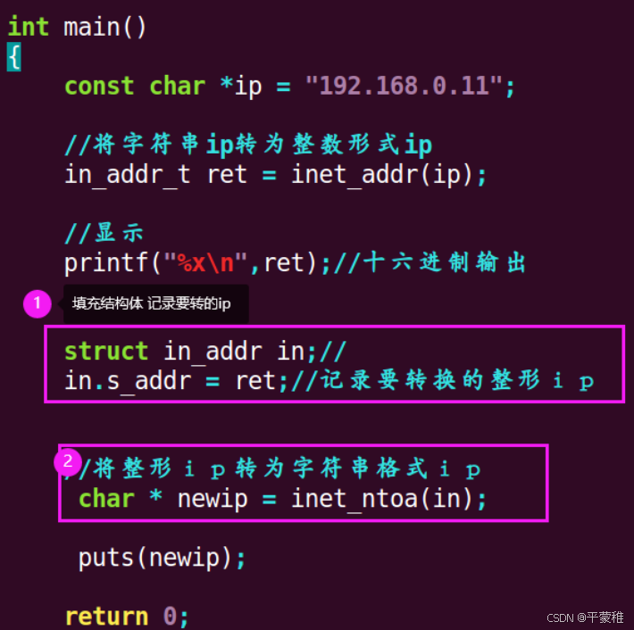 主机字节序转网络字节序主机字节序 ----> 网络字节序 本质上就是 小端模式 -----> 大端模式h //host 主机n //network 网络s //short 短整型l //long 长整型htons () // 将主机字节序的短整型转换为网络字节序htonl () // 将主机字节序的长整型转换为网络字节序