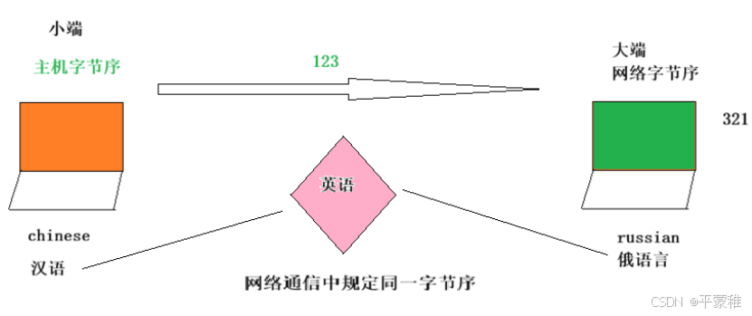 1 )主机字节序( Host Byte Order): 主机字节序是指特定主机体系结构所采用的字节序。不同的计算机 小端存储体系结构可能采用不同的字节序2 )网络字节序( Network Byte Order ): 网络字节序是一种标准化的字节序 在网络通信中,为了保证不 大端存储同主机之间数据的正确传输和解析,通常会采用统一的网络字节序。通常会将数据在发送前转换为网络字节序目前在各种体系的计算机中通常采用的字节存储机制主要有两种: Big - Endian 和 Little - Endian// 鸡蛋![]()