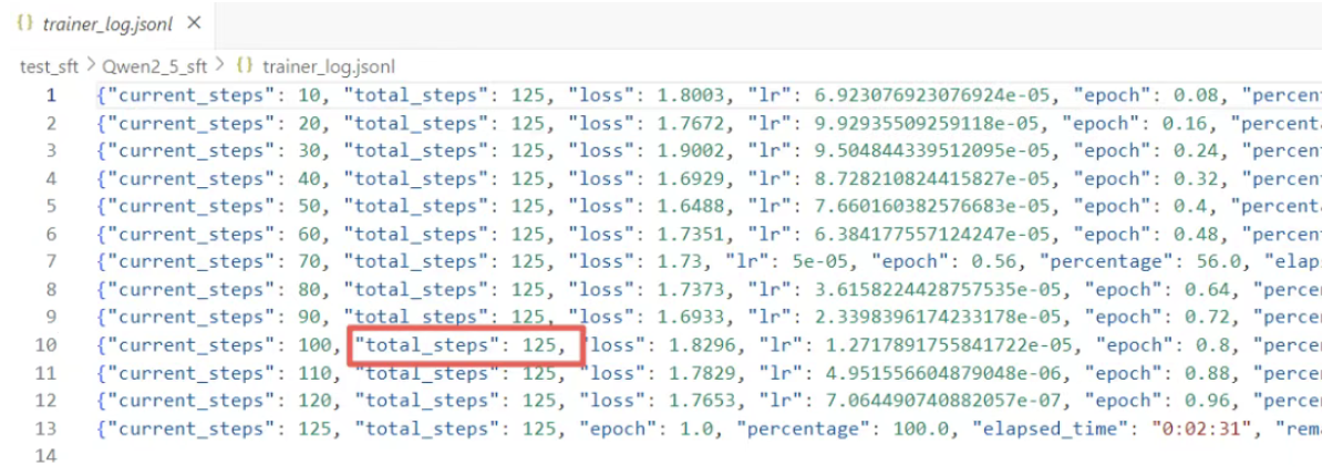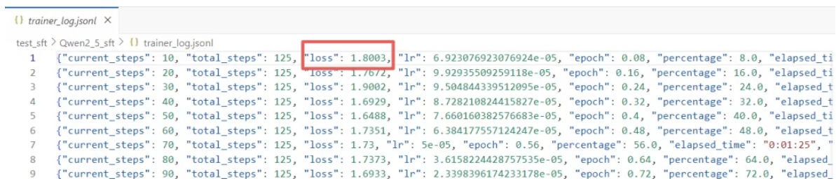 如果大家跟着上篇文章实操过,应该会在模型保存目录 /workspace/test_sft/Qwen2_5_sft/ 下看到一个 trainer_log.jsonl 文件,里面就记录了每个步骤的 loss 值,用来判断模型的拟合情况。