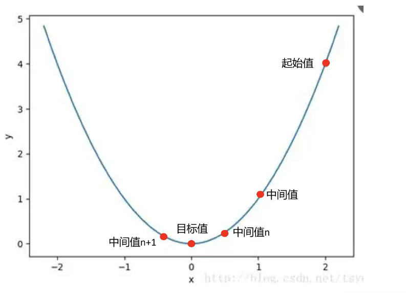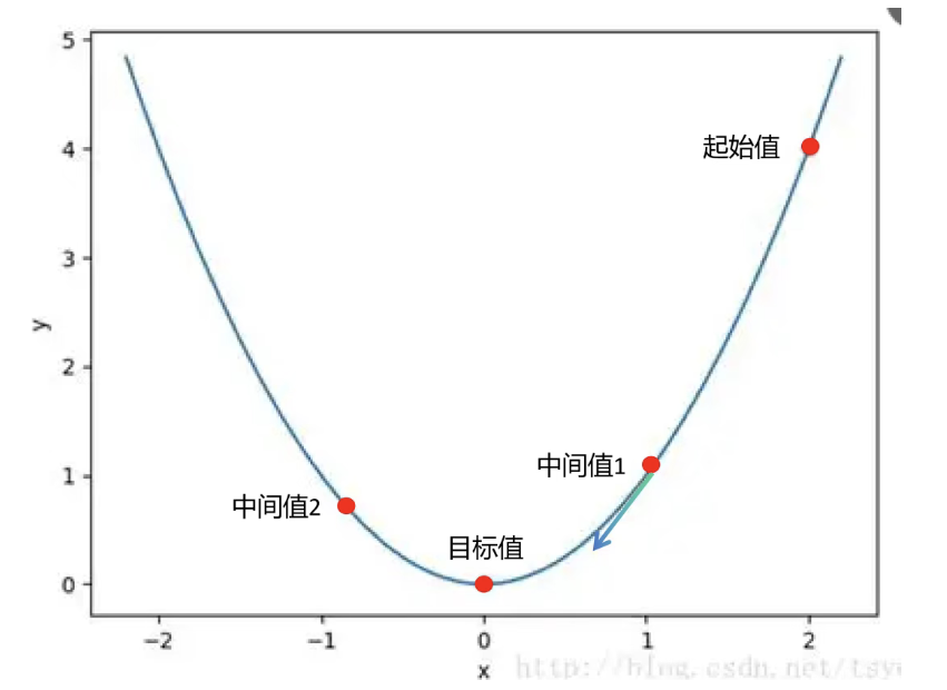 其实不然。看下面这张图,如果当前在“中间值 1”的位置,学习率设置过大,一步就可能跨过最优解,直接跳到“中间值 2”,反而错过了最低点。所以,学习率需要谨慎设置。