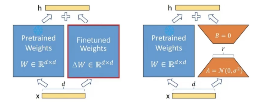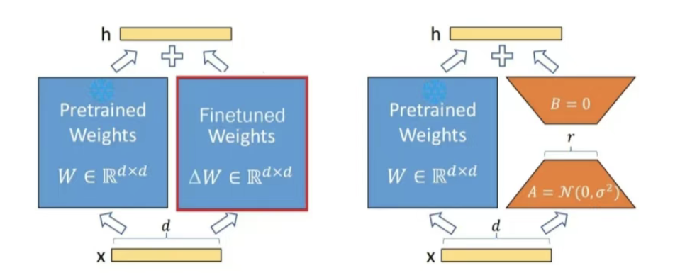 先回顾一下 LoRA 的核心思想:通过引入一个轻量级的“适配器”来间接影响原模型参数,而原始参数本身保持不变。公式可以简化为: