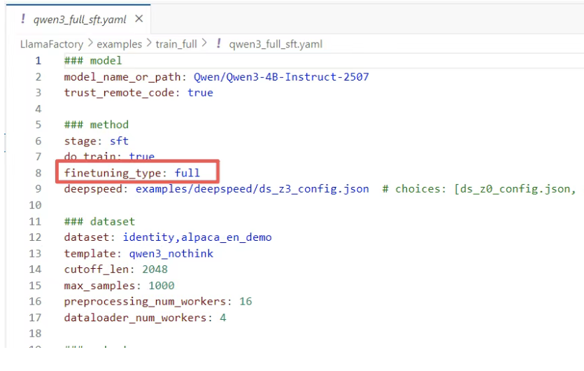 有了这个概念笔者就可以开始逐一解析配置文件中的参数了。上篇文章使用的配置文件路径为 /workspace/test_sft/test_qwen_sft.yaml。