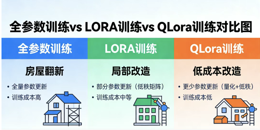 LLaMA Factory 支持多种训练方法,其中最具代表性的三种分别是:全量训练、LoRA 训练 和 QLoRA 训练。为了帮大家直观理解它们的区别,笔者这里把大模型比作一套房子,把大模型训练比作一次翻新改造。