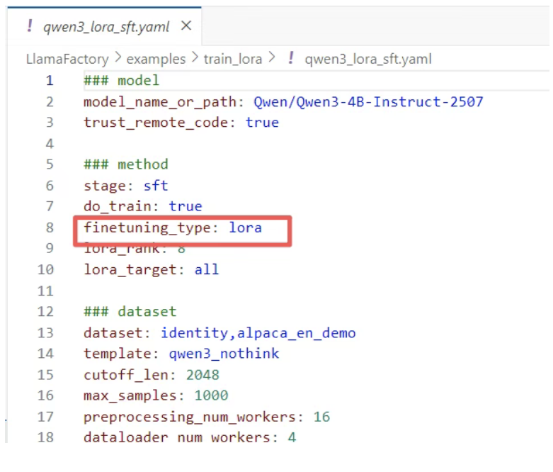 lora,表示采用 LoRA 微调模式,而非全参数微调或 QLoRA。