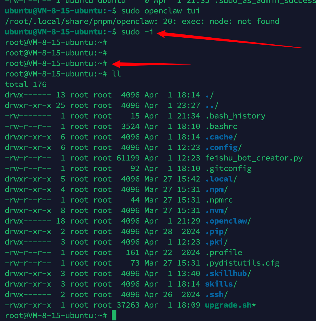 此时本地登录的是 ubuntu 用户,还无法执行 OpenClaw 的终端交互命令,如下图所示: