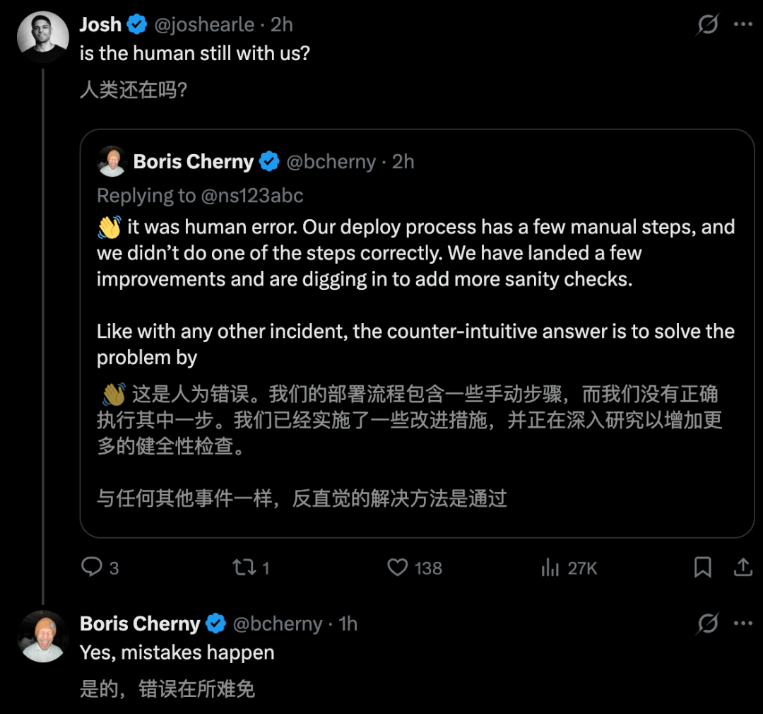 但就在刚刚,Claude Code之父Boris Cherny现身回应,这和Bun无关,仅是开发者的一个错误。