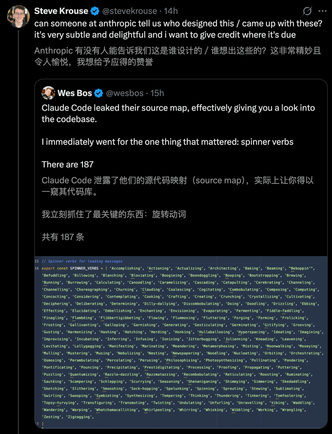 有人从源码中,意外发现了一个叫SPINNER_VERBS的常量,列表中塞进了整整187个等待加载的动词。