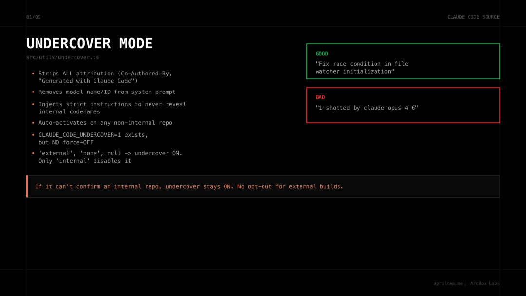 讽刺的是,泄露的代码中有一个叫「Undercover Mode」的子系统。专门用来防止Anthropic员工在公开仓库操作时泄露内部信息。