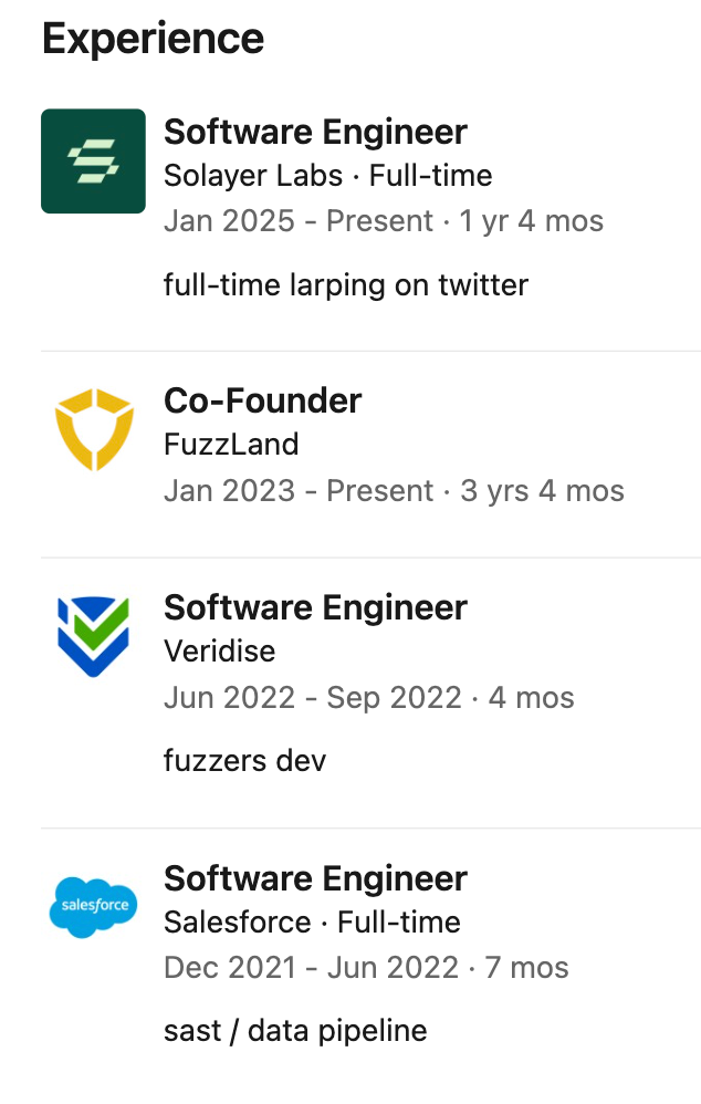 2025年1月,FuzzLand被Solana生态的Solayer收购,Chaofan Shou也随之加入Solayer做软件工程师。