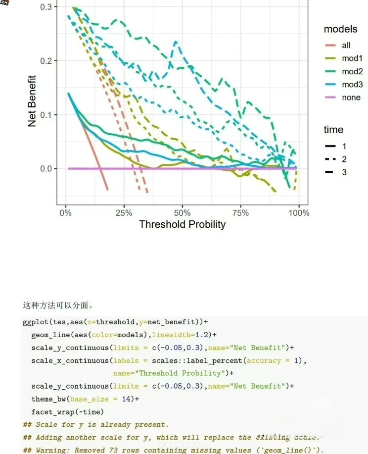 rmda包,使用dca函数计算决策曲线,plot函数绘制决策曲线。决策曲线可以帮助我们评估模型在不同阈值下的临床净获益。