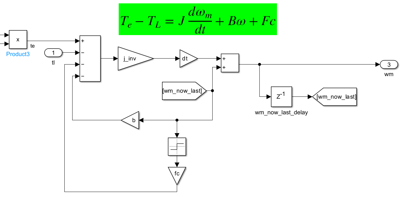 在这里,我们将输出力矩 Te 和 负载的 tl 输入,得到 wm 机械转速。