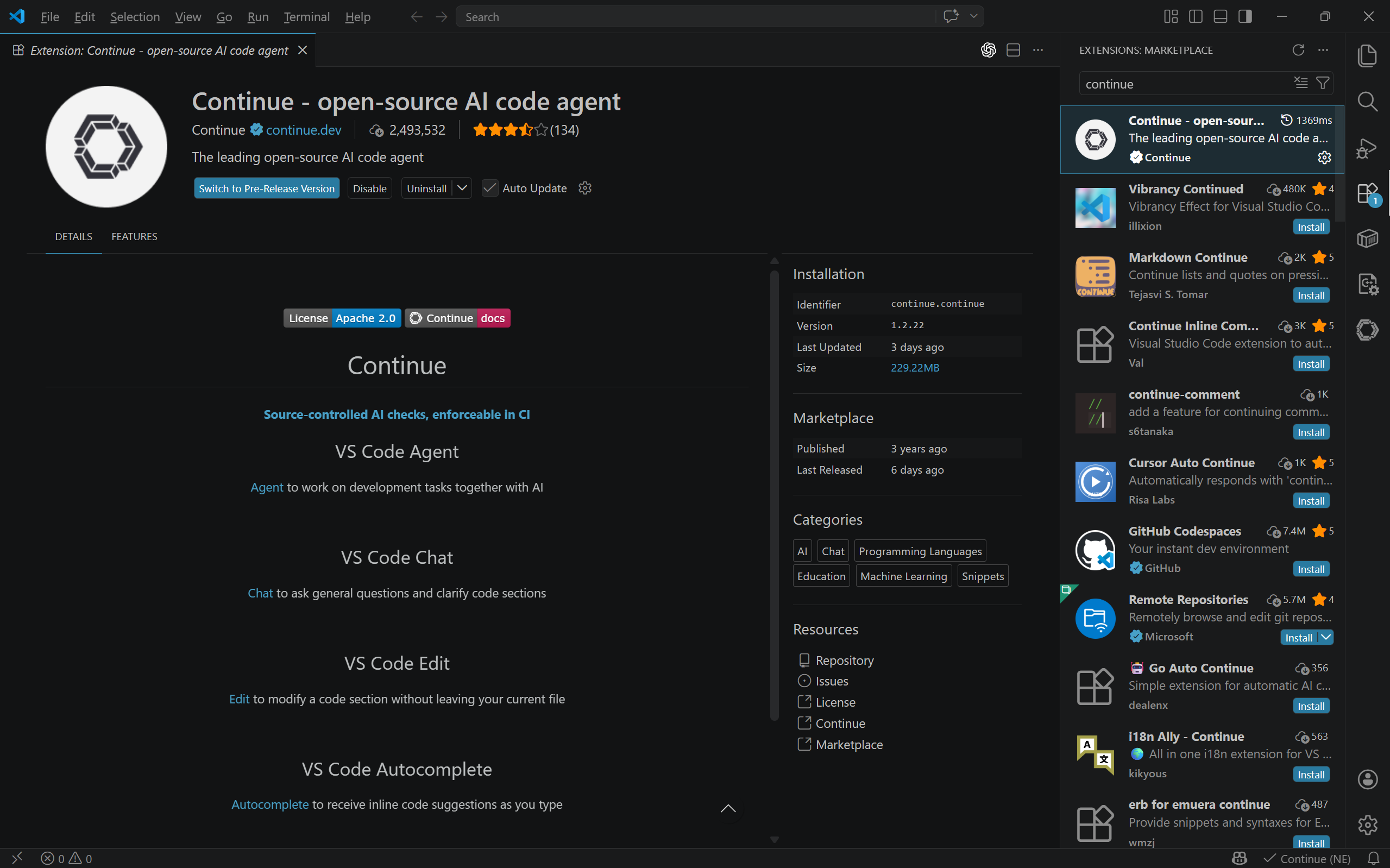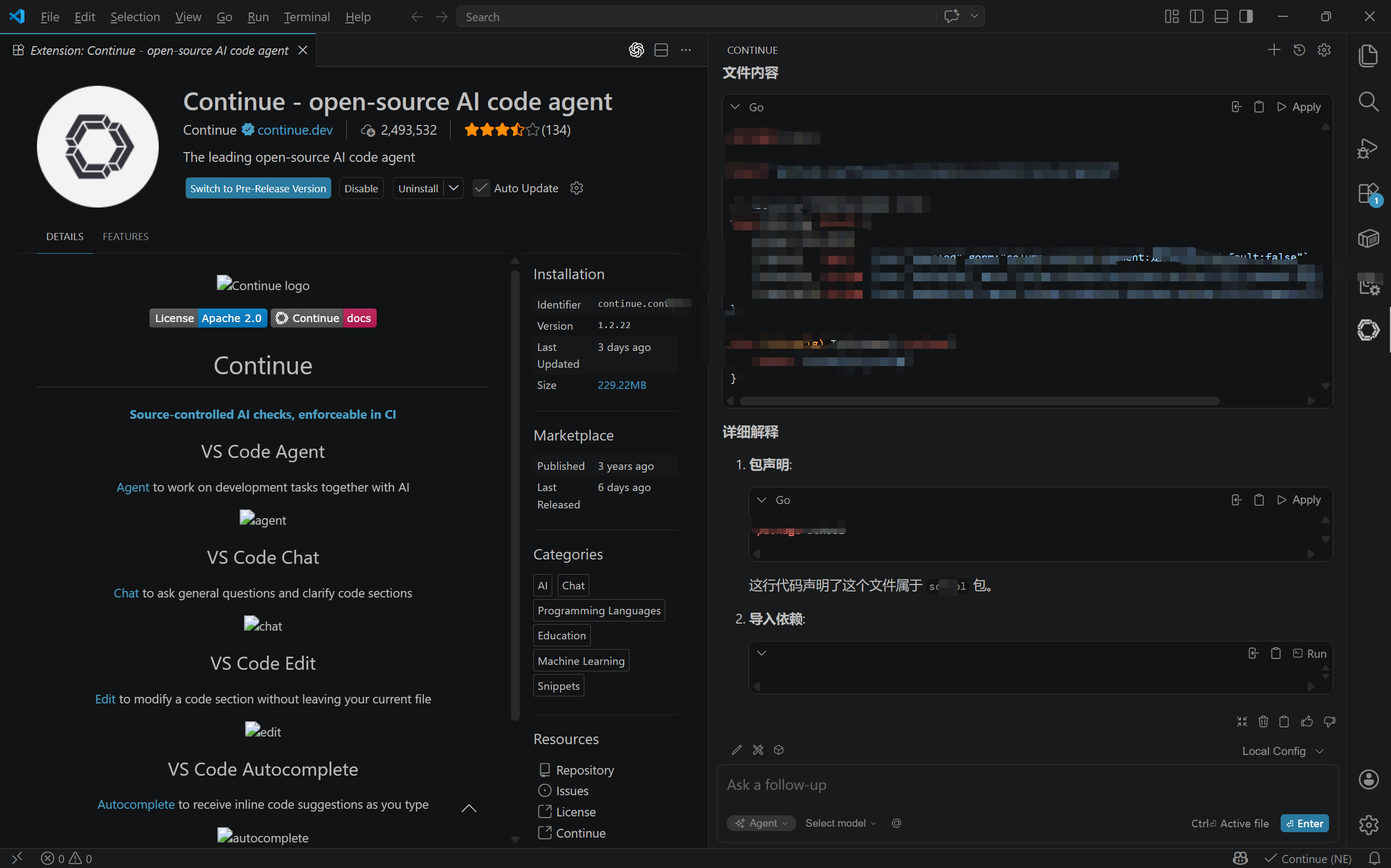 安装完成后,重启 VS Code,左侧边栏会出现“Continue”图标,说明插件安装成功。